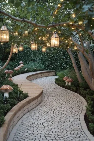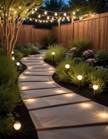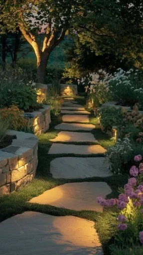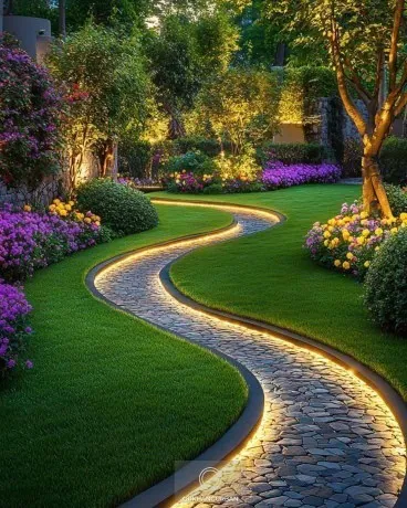 ننفذ مشايات ومسطحات داخل الحديقة بأحجار طبيعية وخرسانية، مع إنارة خارجية LED تبرز جمال الحديقة ليلاً وتخلق أجواء ساحرة.